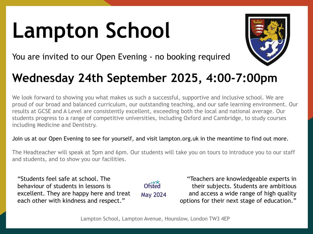 We are delighted to welcome prospective families to Lampton as normal for our open evening on Wednesday 24 September 2025. We hope that you are able to attend and gain a full insight in to the life of Lampton school and find out how educate our students. We will provide an opportunity for prospective students and parents to experience the school's values and ethos in action.